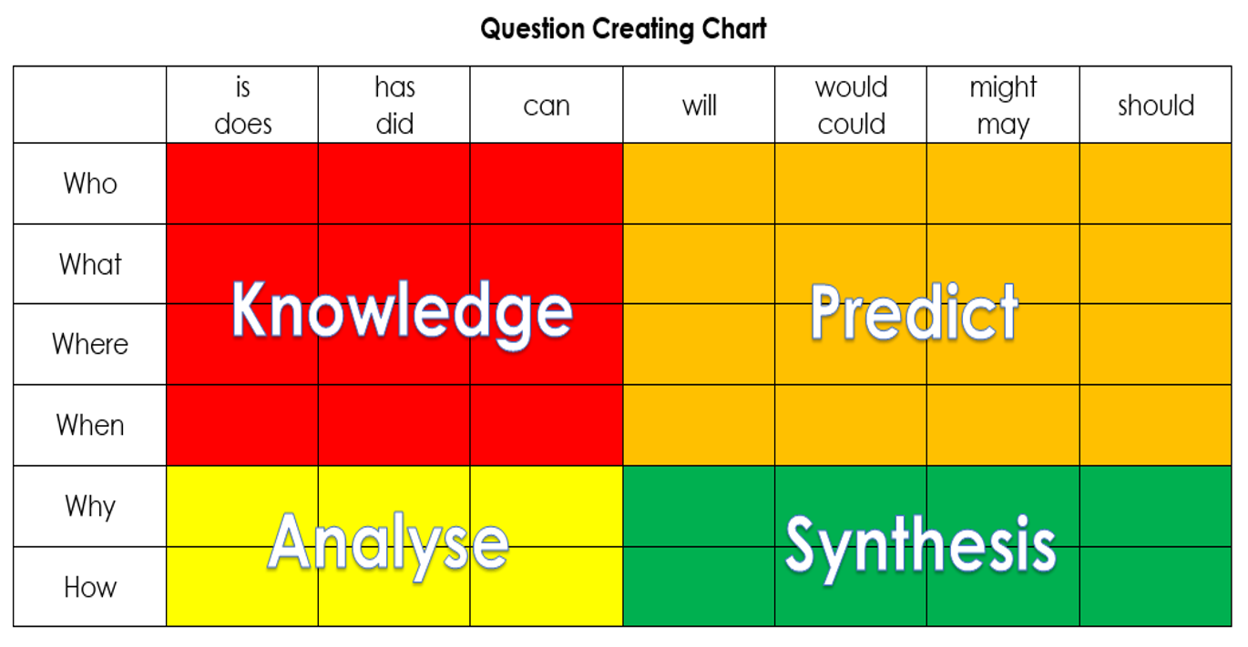 Question chart, Q-Chart or Q-Matrix. You may well have seen this tool online or in a CPD course (which is where I first encountered it) at some point in your teaching career. Developed by Chuck Wiederhold in the 1990s under the name of Q-matrix, it gives a structured approach to designing questions that grow in pitch and expectation. Questions compare event, situation, choices, person, reasons and means against if the subject is present, past, a possibility, a probability, a prediction or need imagination. The interactions between these themes can be grouped into the four themes or areas of knowledge, prediction, analysis and synthesis. Knowledge questions are the simplest and prompt knowledge retrieval or superficial retrieval from a source. Prediction questions, as you might have predicted encourage children to … predict from a source mixing prior learning with some reasoning. Analyse questions are where skills of inference are applied, especially those Why questions. The most challenging questions are formed from the synthesis section, with question openers such as “why will …” or “how might …”. Questions that need children to blend learning from multiple occasions to form an answer.